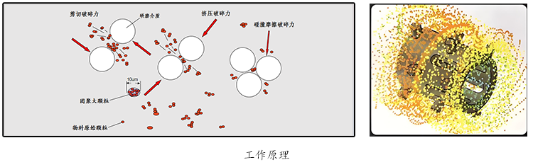 2.1、研磨介质被转子转动加速到研磨桶内壁,向桶壁运动的研磨介质会与紧贴在研磨桶内壁上的研磨介质或研磨物料发生碰撞,产生的碰撞能用于物料的分散与破碎。